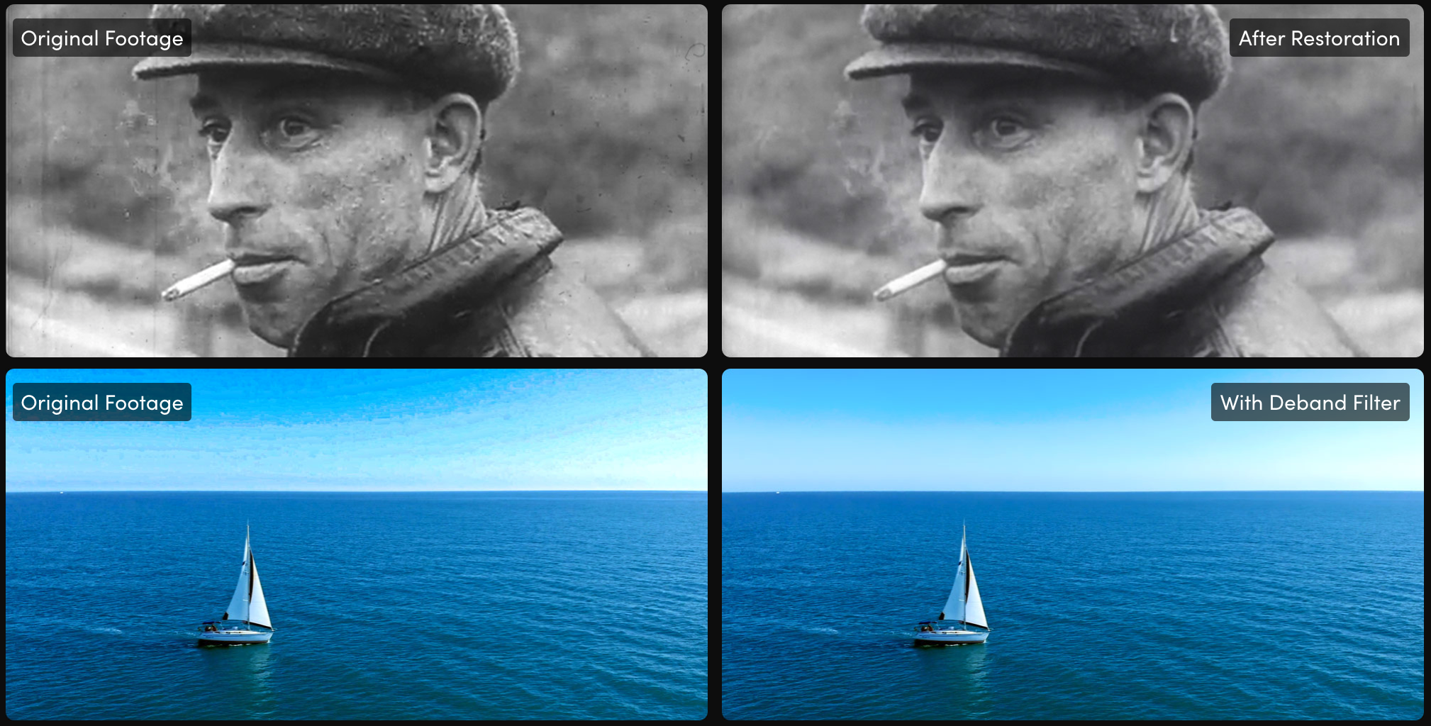 The color page has 8 unique image restoration tools in Resolve FX Revival. Simply drag and drop any of them onto a node to use them. There’s an automatic dirt removal tool for reducing or eliminating dirt and scratches, along with a dust buster plug‑in for removing dust and a deflicker plug‑in, all of which are great for cleaning up old film scans. The chromatic aberration plug‑in can reduce color fringe and artifacts caused by inferior lenses, the dead pixel fixer removes dead or stuck pixels, and the deband filter will smooth out pixelated gradients from digital cameras and highly compressed footage. The object removal and patch replacer let you quickly paint small objects out of an image.